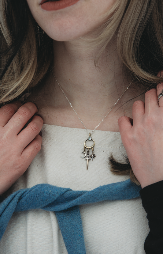 VARYN II High Fantasy Moonstone Sword Necklace in Brass and Silver