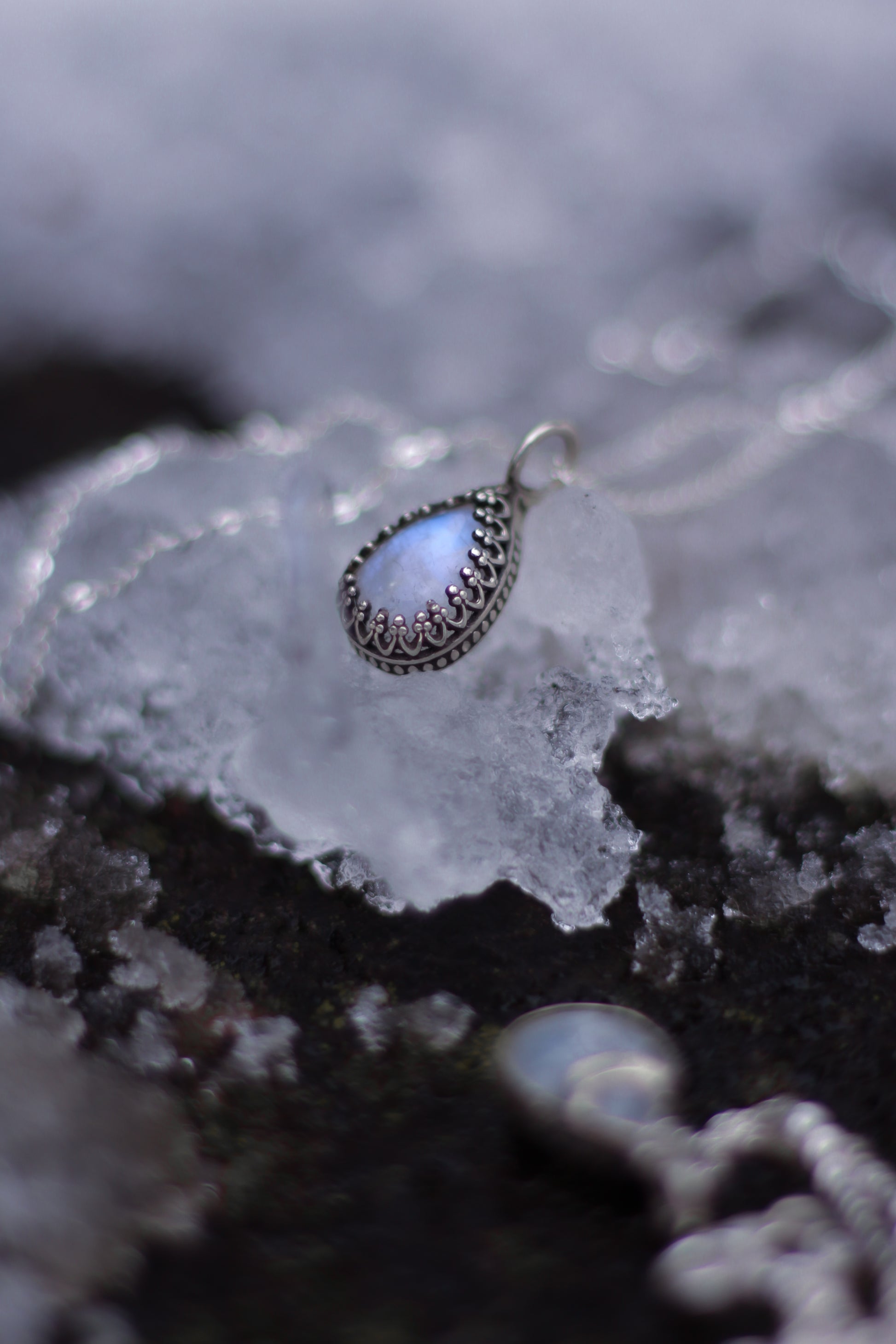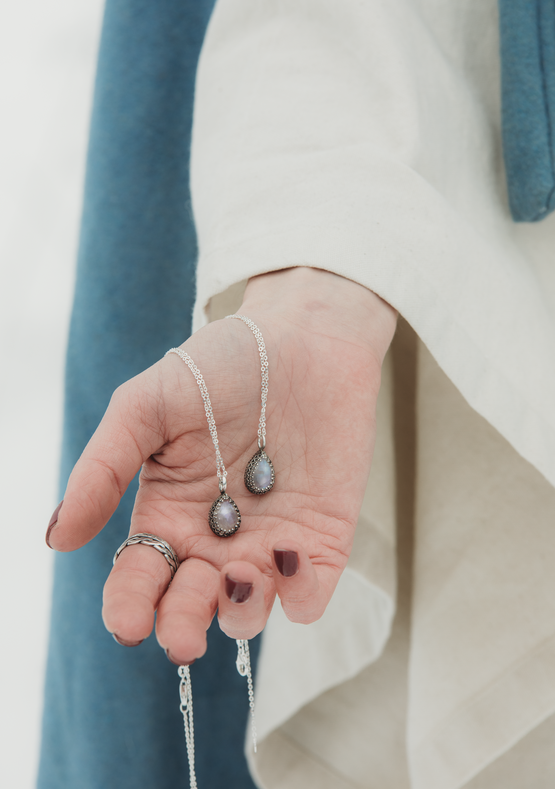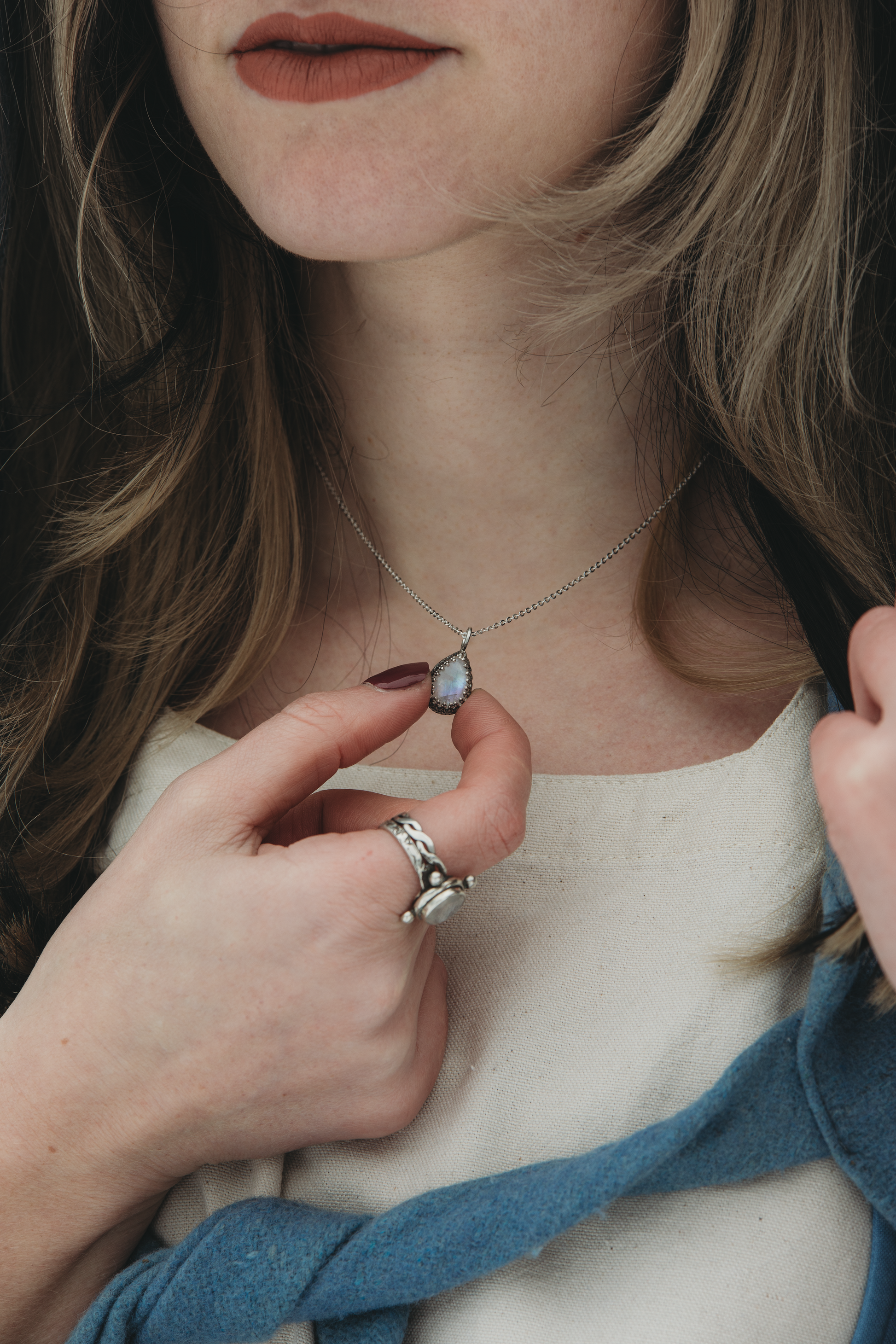 Die SYLÚN-Halskette ist aus Sterlingsilber gefertigt und mit einem tropfenförmigen Mondstein versehen. Der Stein strahlt in schimmernden blau und weiß, je nachdem, wie er das Licht einfängt.