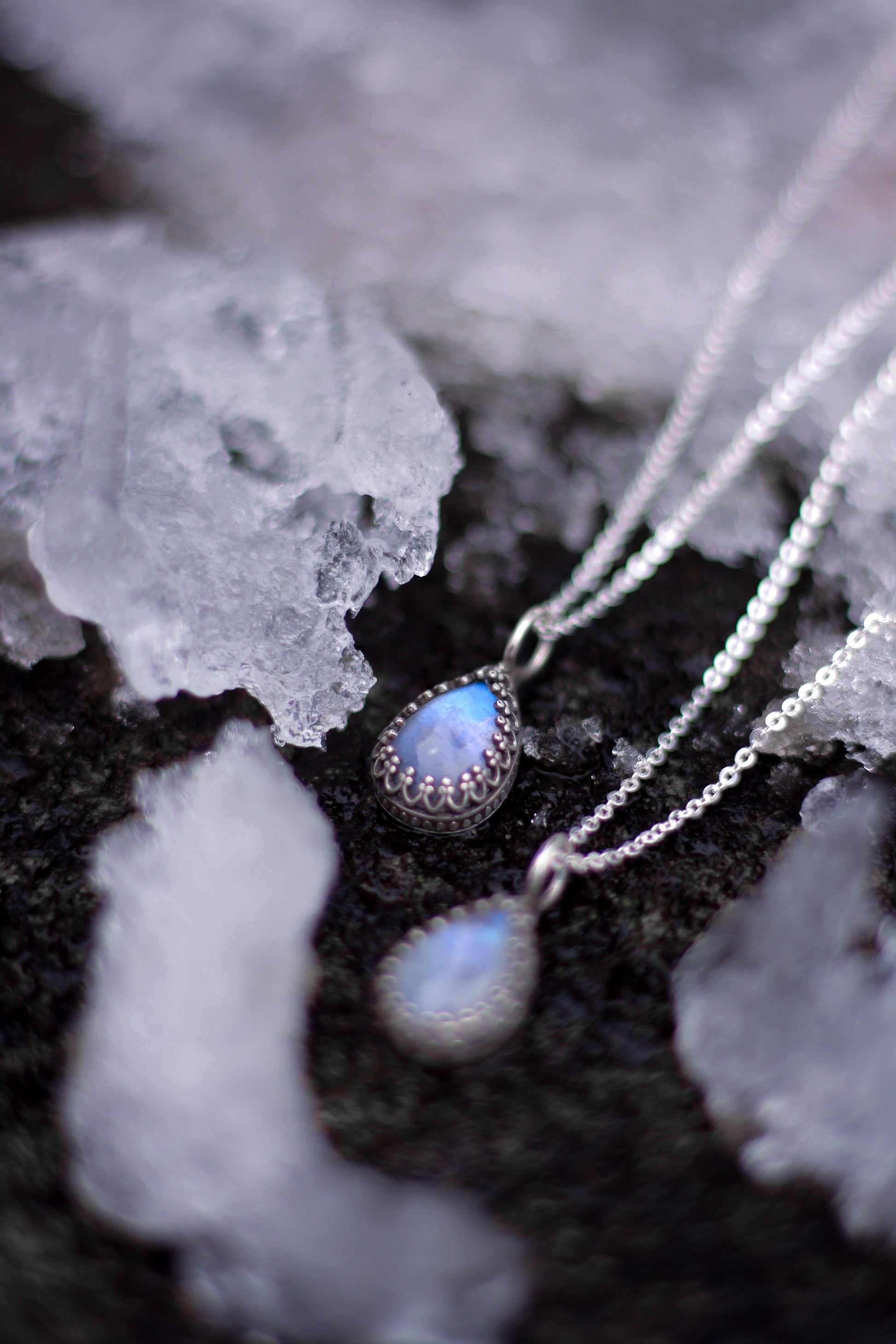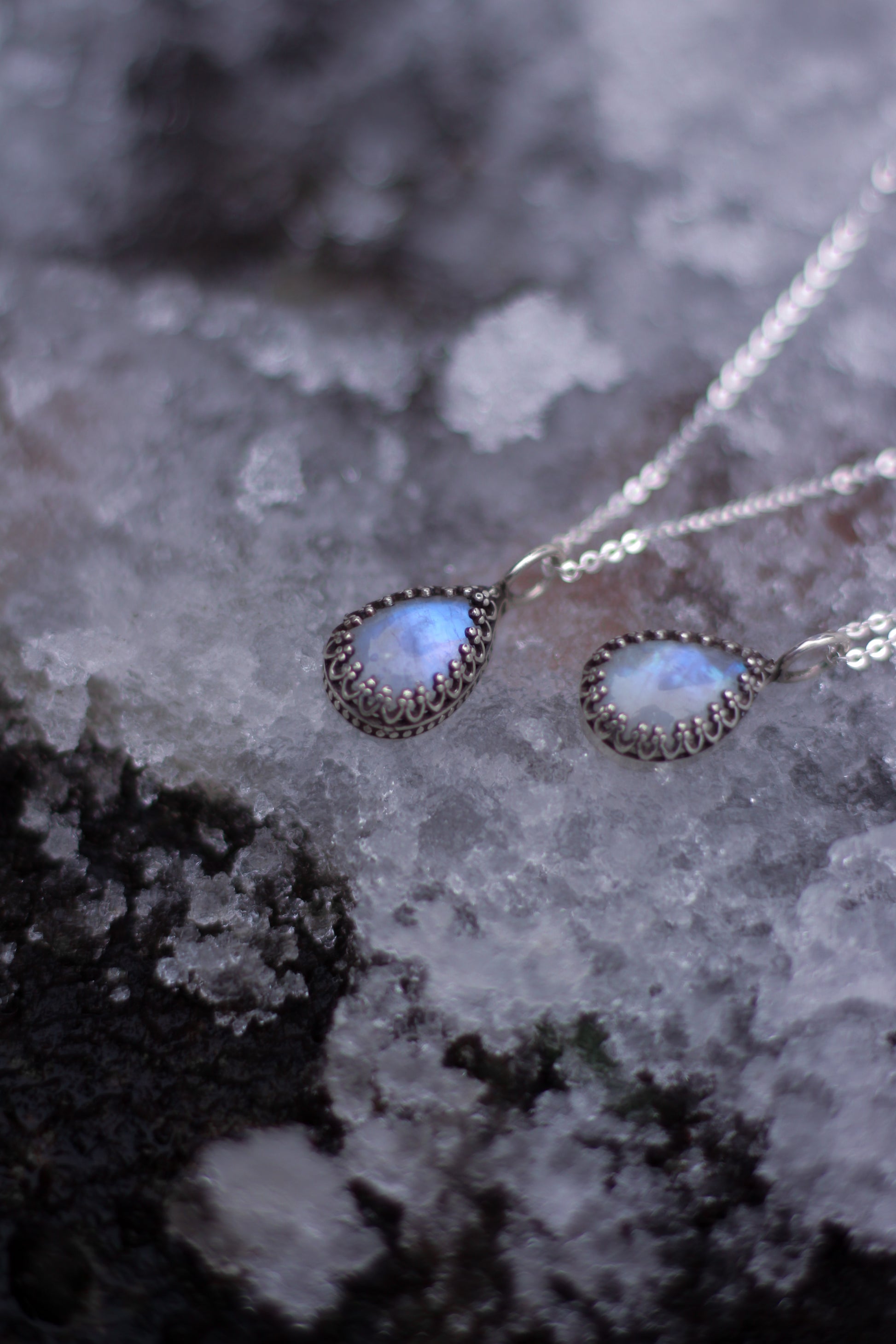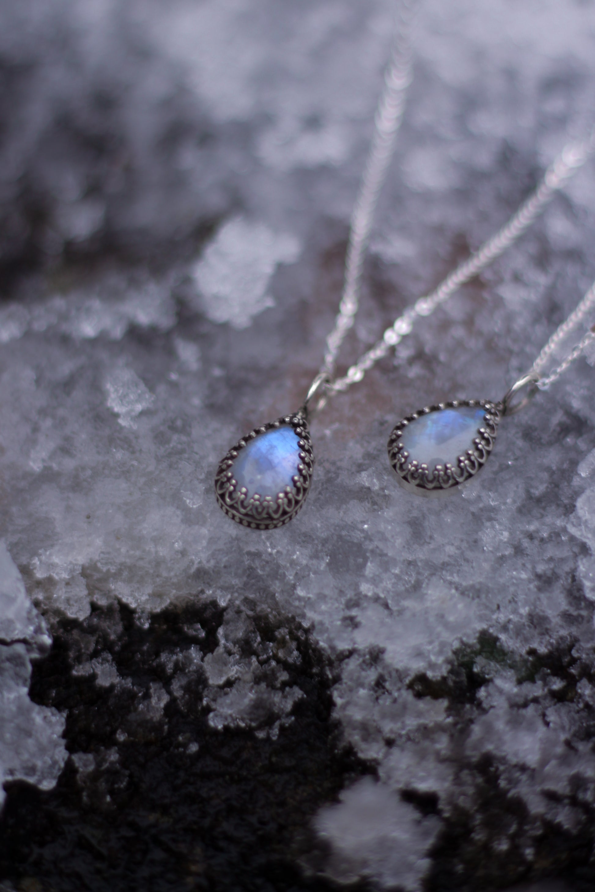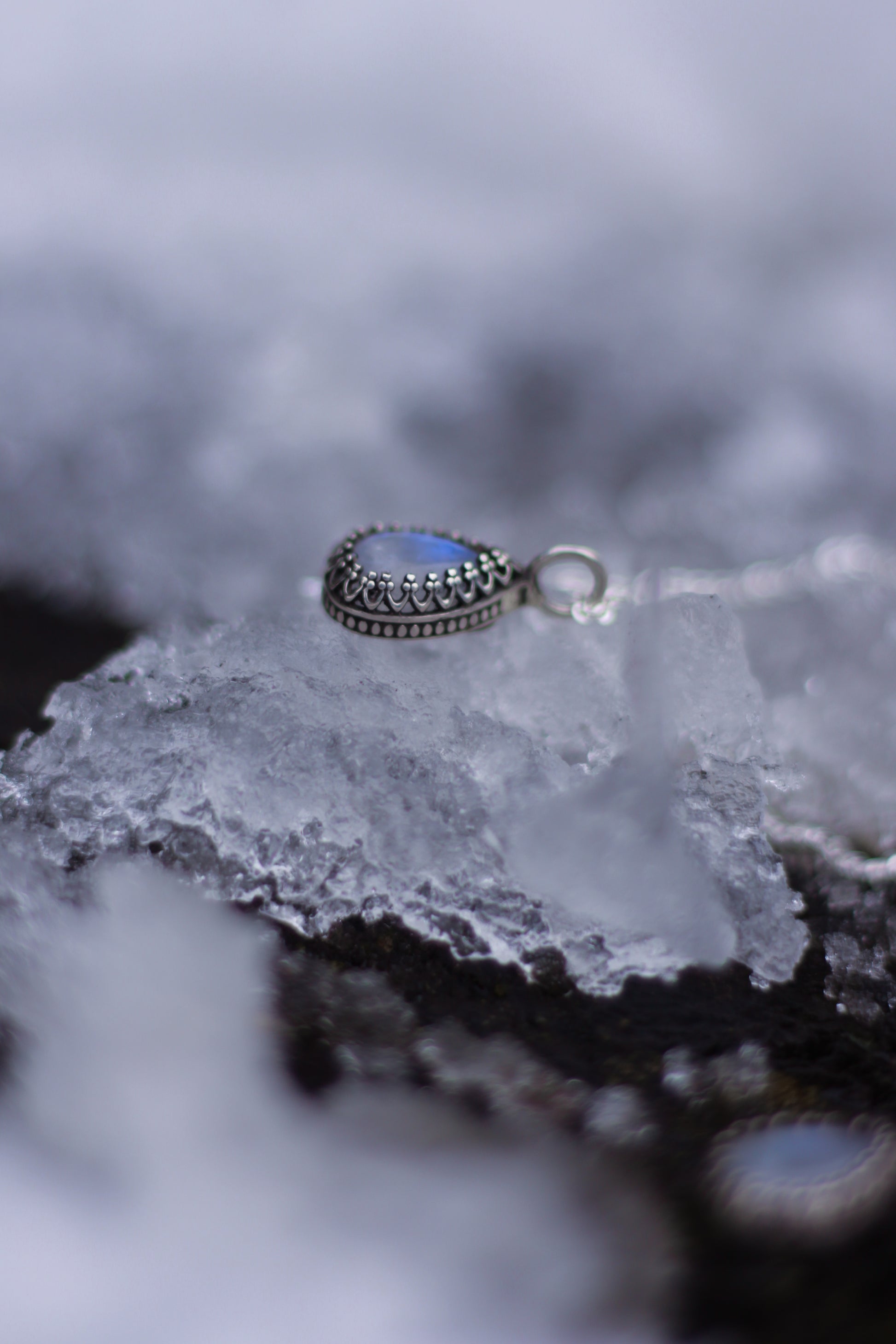 Die SYLÚN-Halskette ist aus Sterlingsilber gefertigt und mit einem tropfenförmigen Mondstein versehen. Der Stein strahlt in schimmernden blau und weiß, je nachdem, wie er das Licht einfängt.
