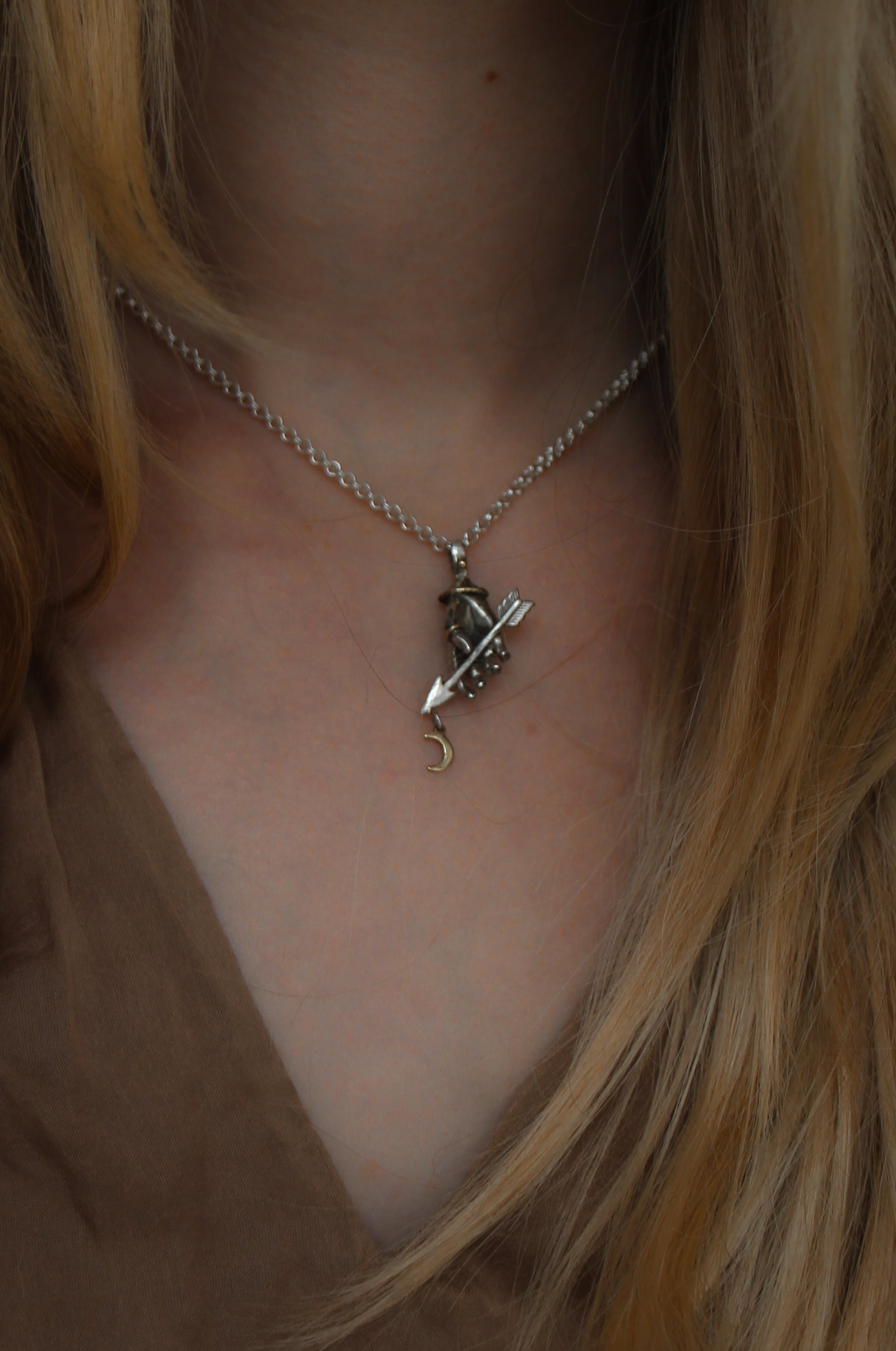 This delicate sterling silver necklace features a small victorian-inspired hand pendant, holding a silver arrow like a sacred offering. The hand is decorated with tiny brass jewellery. From the tip of the arrow hangs a brass moon, symbol of intuition and transformation.. A treasure for lovers of history, archaeology, and those drawn to mystical, witchy elegance. Timeless, symbolic, and one of a kind.