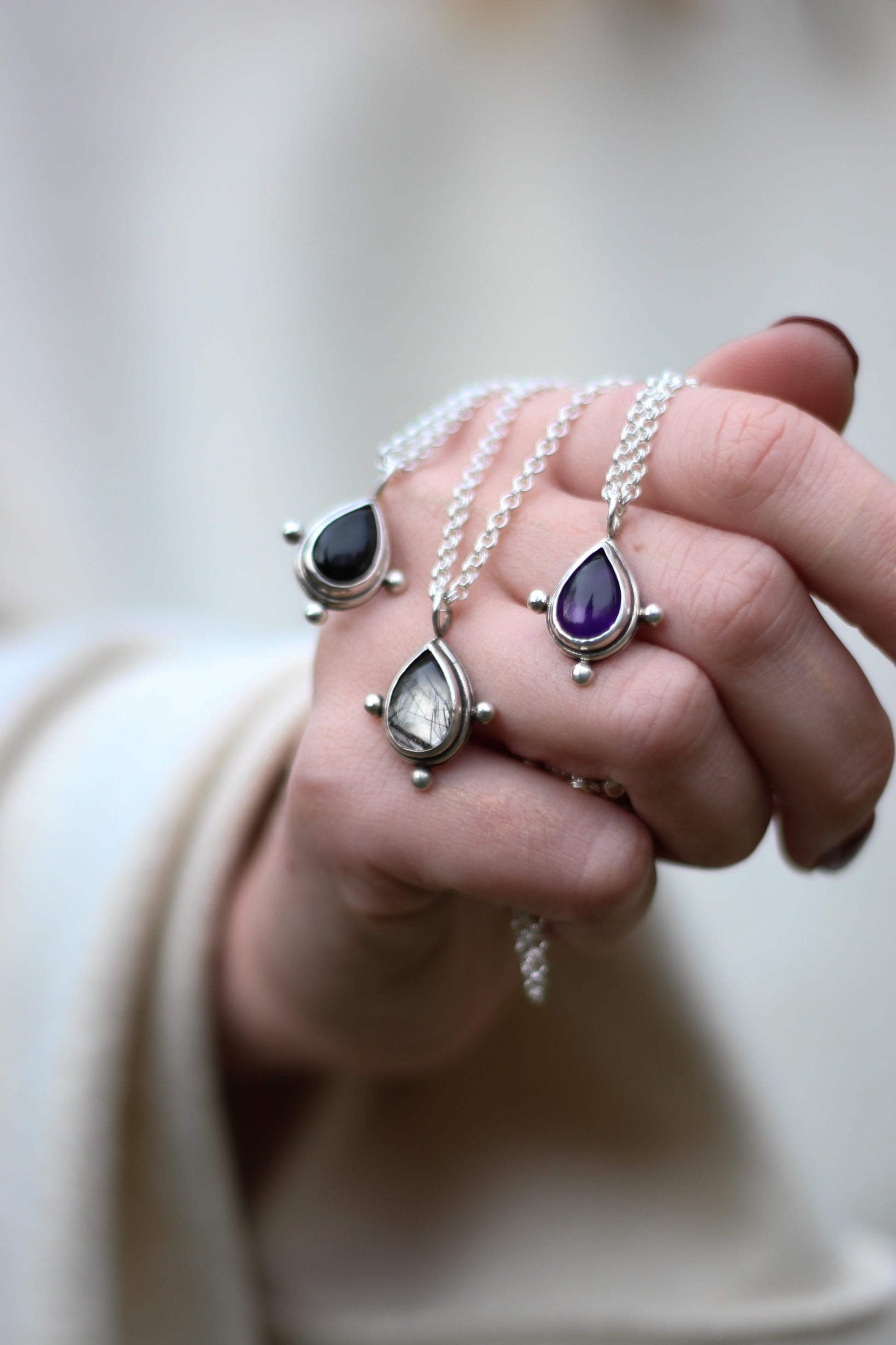 This powerful necklace carries a shimmering rutilated quarz at its heart. The drop shaped pendant is approx. 3cm in size and made entirely of sterling silver. You can choose the necklace length (40cm displayed on the pictures).
